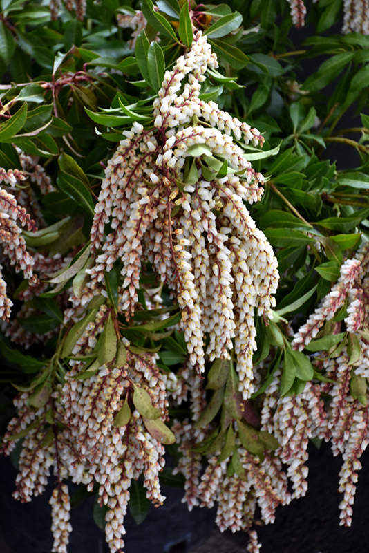 A popular ornamental broadleaf evergreen shrub with delicate and showy chains of small white bell-shaped flowers and fiery red emerging foliage, extremely colorful in spring; performs best in moist, organic and acidic soils