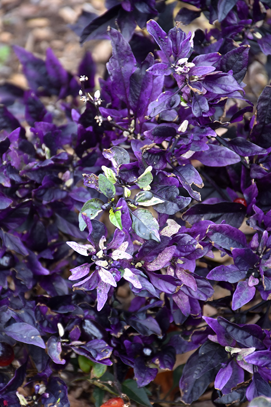 Purple Flash Ornamental Pepper is primarily grown for its highly ornamental fruit. The fruits are showy deep purple peppers with black overtones, which are carried in abundance from mid summer to early fall. It features subtle purple star-shaped flowers at the ends of the stems from late spring to mid summer. Its pointy leaves emerge white in spring, turning black in color with showy purple variegation and tinges of purple throughout the season.
